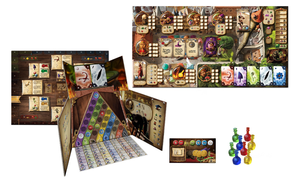 Alchimistes est un jeu de stratégie, de prise de risque et de déduction. Allez-vous prendre le temps de pousser vos expérimentations et vérifier vos théories, ou allez-vous vous dépêcher de publier pour gagner rapidement en réputation ? Allez- vous payer pour confirmer la dernière théorie sur les crapauds, ou conserver votre argent pour acheter un artefact ? Est-il vraiment judicieux de vendre une potion à ce barbare lourdement armé alors que vous n’êtes pas tout à fait certain de ses effets ?