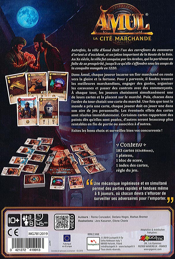 Dans Amul, chaque joueur incarne un fier marchand en route vers la gloire et la fortune. Pour y parvenir, il faudra trouver les meilleures marchandises, engager des gardes, organiser les caravanes et passer des contrats avec des commerçants. À chaque tour, les joueurs choisissent simultanément une de leurs cartes et la placent sur le marché. Puis, chacun dans l’ordre du tour choisit une carte du marché. Une fois que tout le monde a pris une carte, chaque joueur doit en jouer une dans son aire de jeu personnelle. Les éventuels effets des cartes sont résolus immédiatement. Certaines cartes rapportent des points dès qu’elles sont posées, d’autres seront beaucoup plus rentables en fin de partie ou associées à d’autres. Faites les bons choix et surveillez bien vos concurrents !