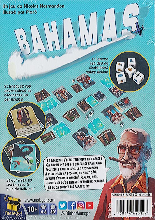 Bahamas est un jeu de dés plein de rebondissements. Lancez les dés et choisissez votre action, braquez vos adversaires et récupérez un parachute… afin de survivre au crash avec le maximum de dollars.