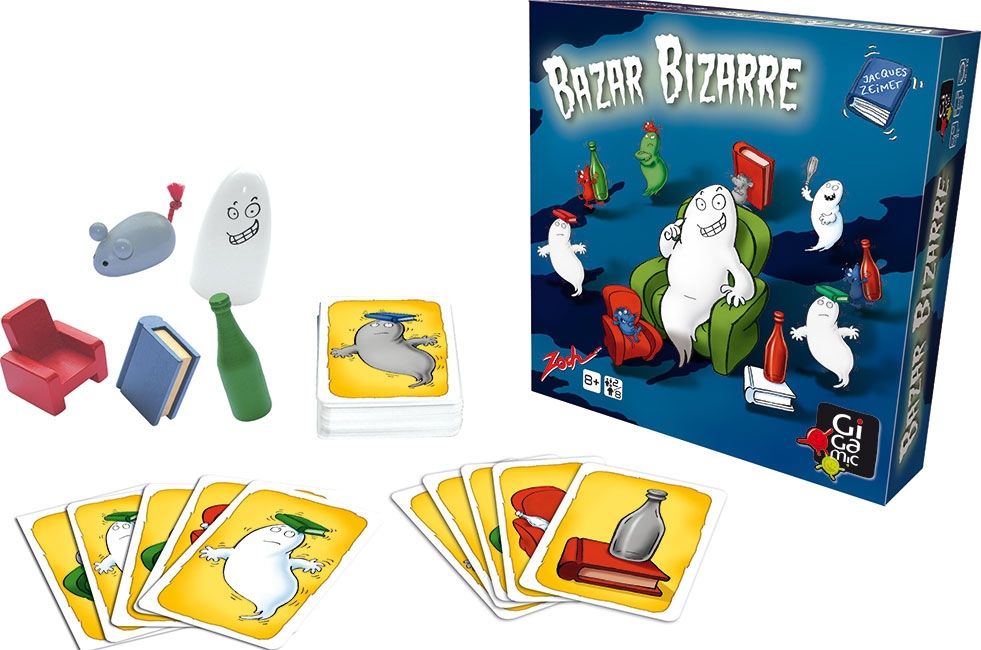 Pour les pièces en bois : la bouteille est verte, le fantôme est blanc, le fauteuil est rouge, le livre est bleu et la souris est grise ! Mais sur les cartes, toutes ces couleurs se mélangent… Il y a 2 objets sur chaque carte, et dès que l’une d’elle est retournée, il s’agit d’être le plus rapide à choper le bon objet : si la carte présente un objet de la bonne couleur, il faut vite l’attraper ; mais si les 2 objets représentés ne sont pas de la bonne couleur, alors il faut vite attraper l’objet qui n’a rien de commun avec la carte : ni l’objet, ni la couleur !