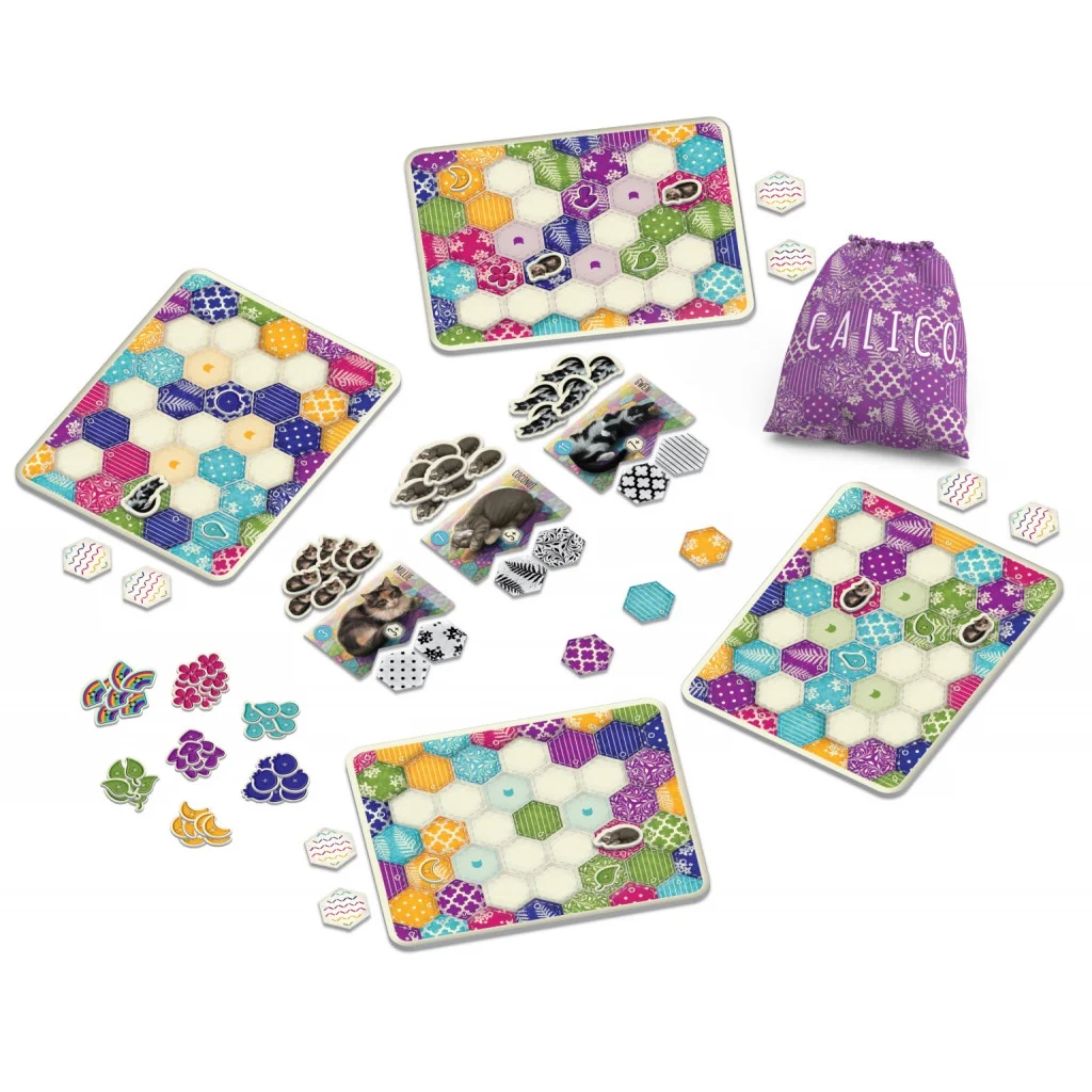 Dans Calico™, les joueurs, en compétition les uns contre les autres, vont tenter de composer le quilt le plus douillet en draftant et en plaçant des tuiles de tissus de différentes couleurs et de différents motifs sur leur Plateau de quilt.