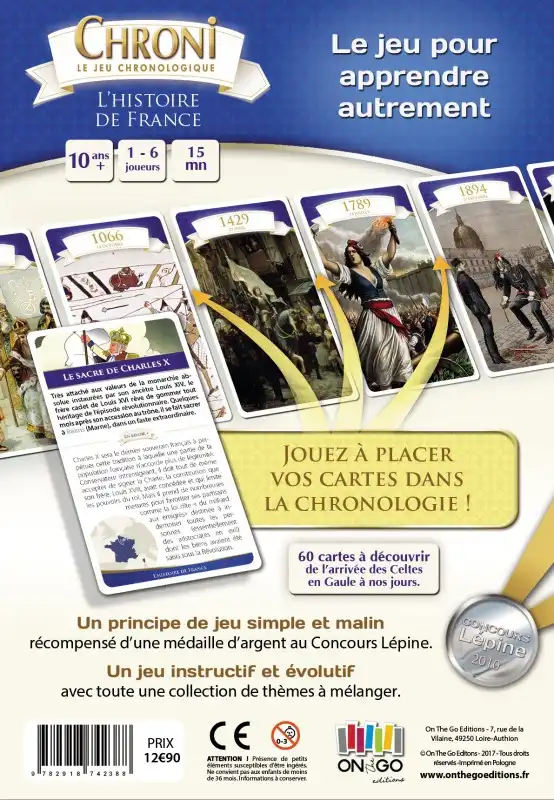 Chroni – Histoire de France est un jeu de cartes conçu pour améliorer et tester sa culture générale en explorant les événements marquants de l’histoire de France. De l’arrivée des Celtes (vers -700) à la disparition du franc en 2002, le jeu propose une sélection de 80 évènements incontournables de notre passé historique.