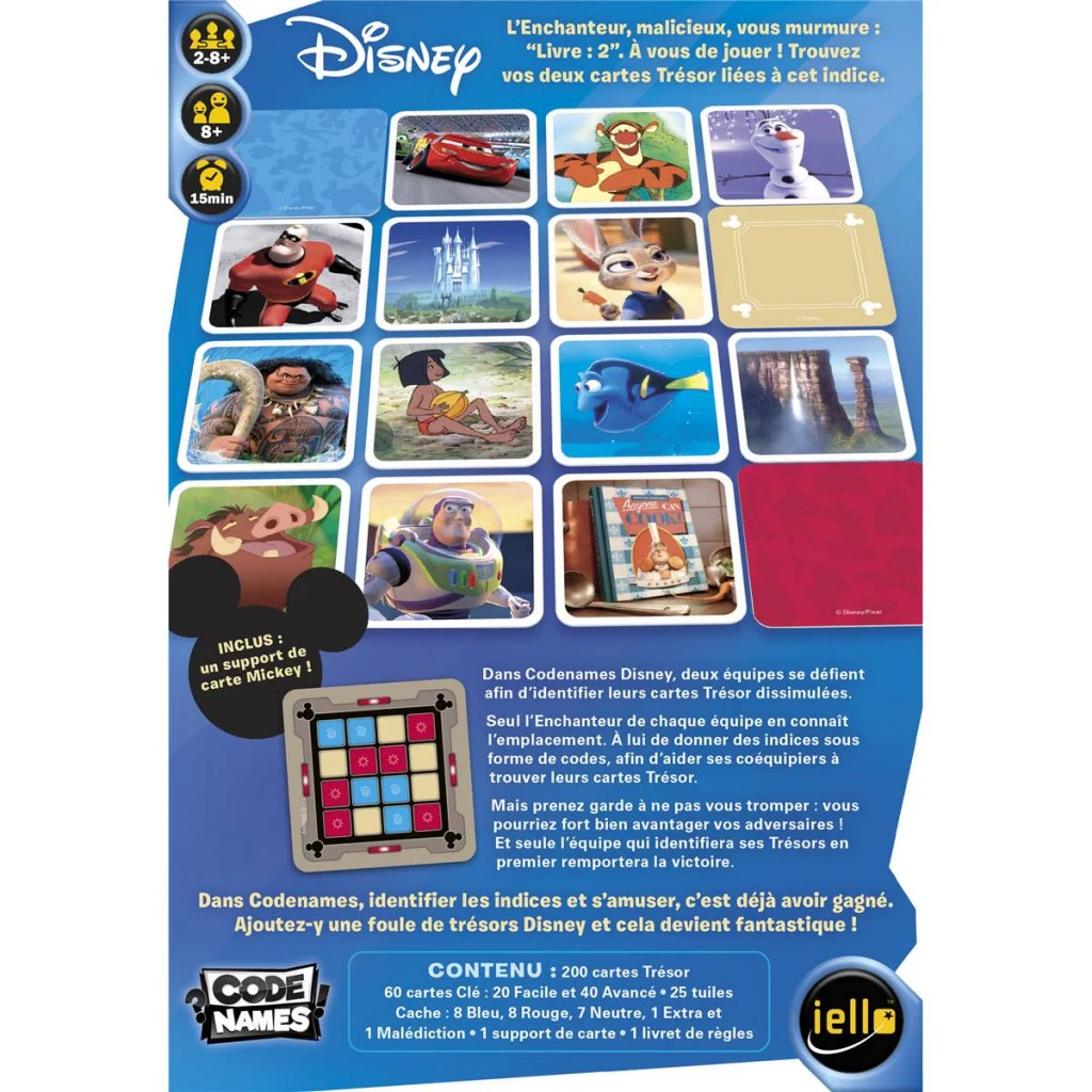 Dans Codenames Disney, deux équipes se défient afin d’identifier leurs cartes Trésor dissimulées.