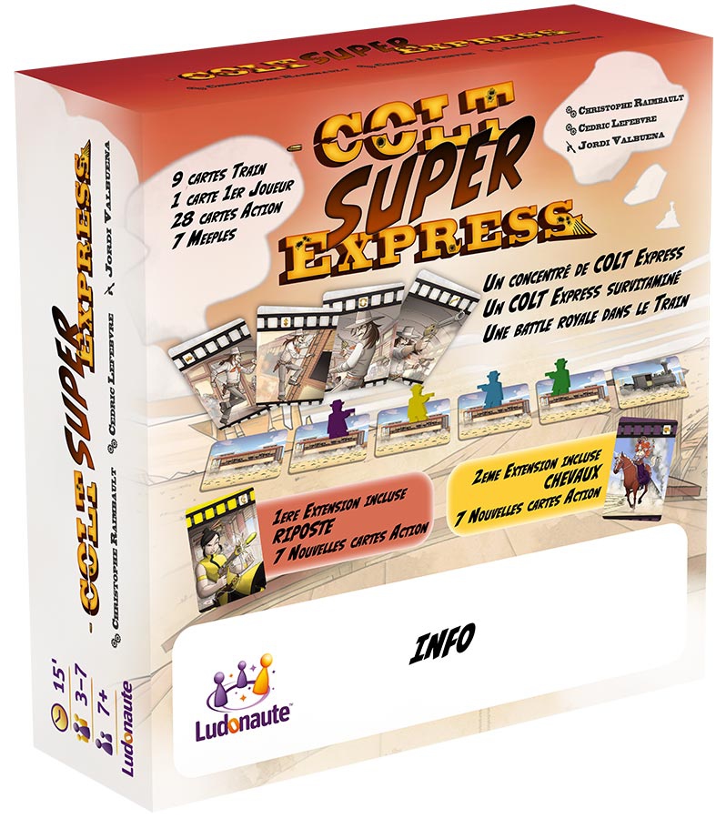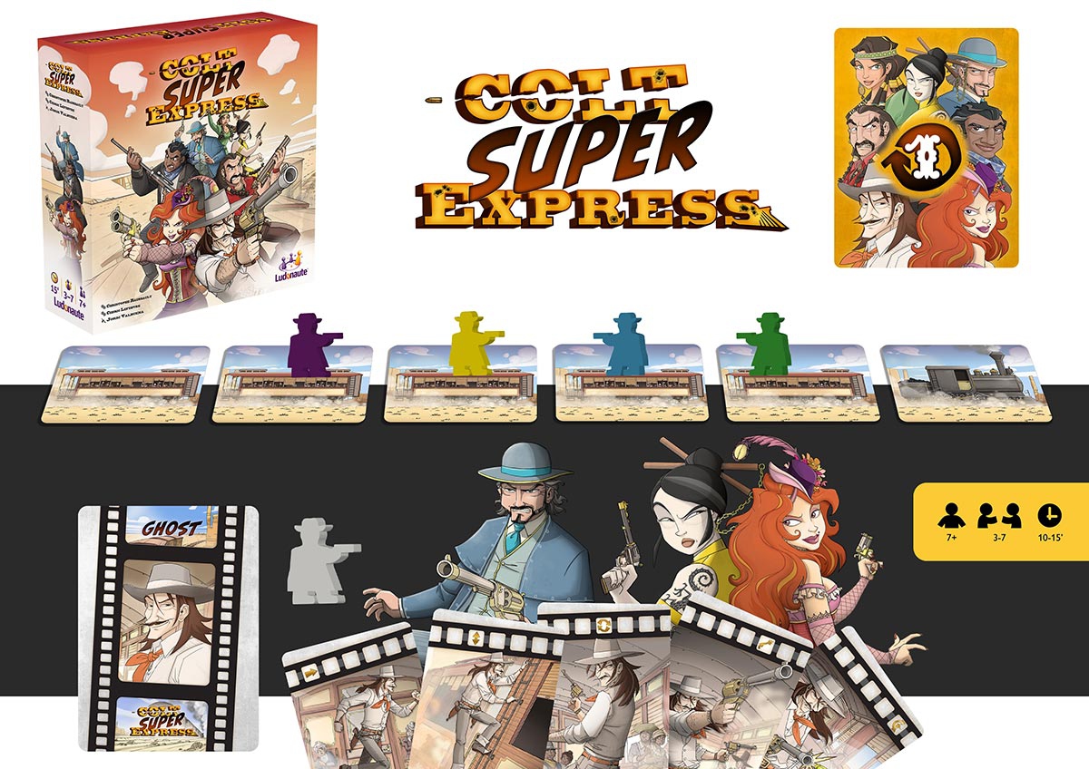Vous avez aimé Colt Express ? Vous allez adorer Colt Super Express. Ce concentré est encore plus fun et plus dynamique. Le but n’est plus de finir le plus riche mais de finir tout court ! Soyez le dernier dans le train pour remporter la partie mais attention aux explosifs qui réduisent le nombre de wagons et aux tirs affûtés des autres Bandits.
