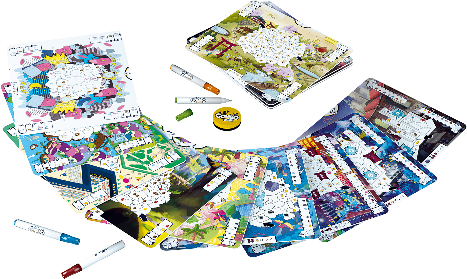 Le jeu est composé de cartes « plateaux » réversibles et effaçables.