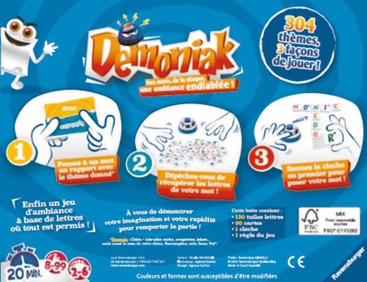 Dans le jeu Demoniak, à chaque manche, un thème est révélé. Trouvez un mot en rapport et soyez le premier à sonner la cloche pour pouvoir le placer ! Plus le mot est long plus vous remporterez de points… Mais attention à ne pas vous faire couper l’herbe sous le pied par vos adversaires… Et le rapport avec le thème alors ? Et bien, à vous de le trouver ! Tout est possible du moment que vous arrivez à le justifier !