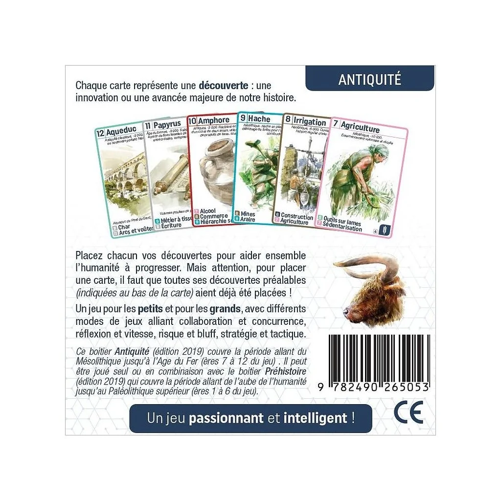 Ce boîtier Antiquité couvre les ères 7 à 12 du jeu. Il peut être joué seul ou avec le boîtier Préhistoire (Édition 2019), qui couvre les ères 1 à 6.