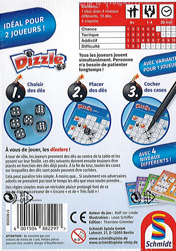 Dizzle, choisissez vos dés et cochez les cases. Cela semble simple ? Détrompez-vous car vos adversaires lorgnent sur les dés dont vous avez besoin ! Dès 8 ans. Un nouveau Roll and Write original et futé comme tout ! À tour de rôle, choisissez soigneusement un des dés au centre de la table et placez-le sur votre feuille sur une case doté du même chiffre : mais attention, le prochain dé que vous ramasserez devra être posé à côté d’un de ceux déjà placés.