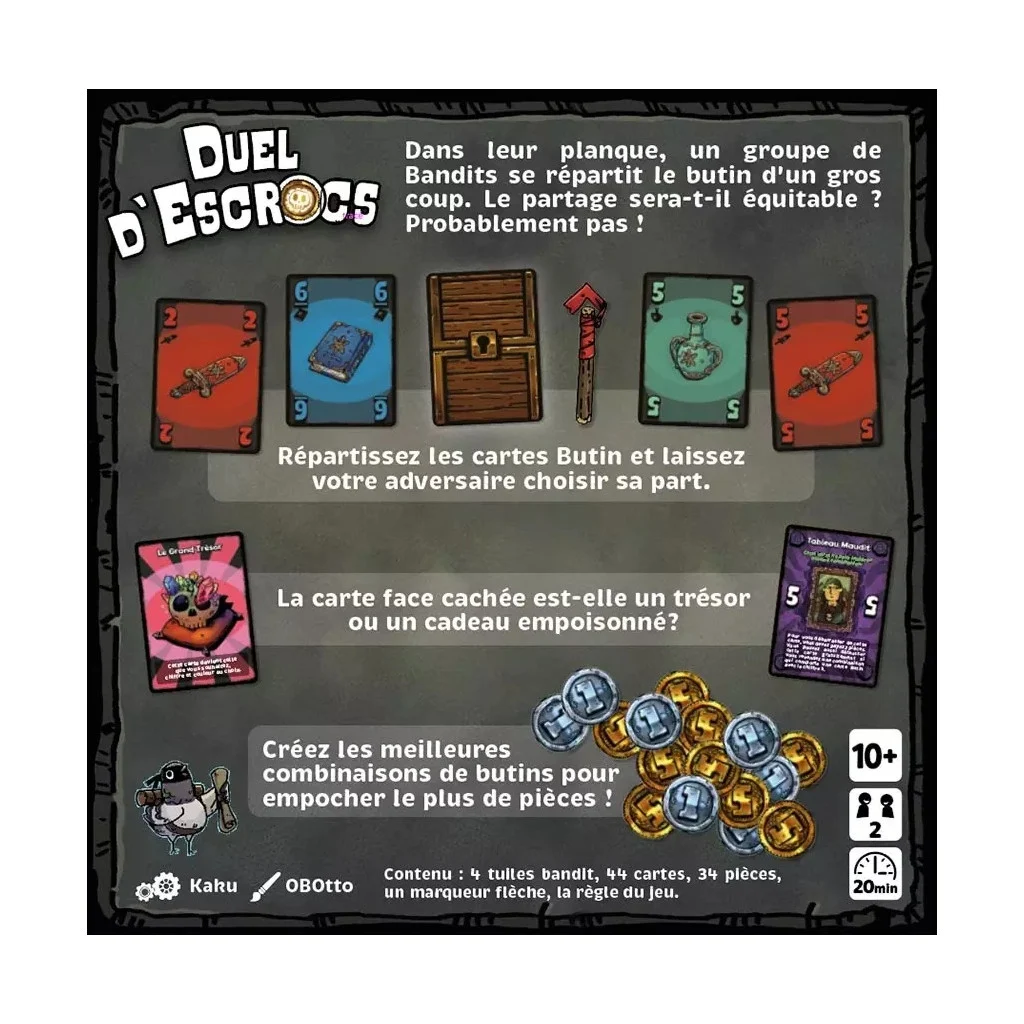 Ce duel rapide et dynamique garantit des parties remplies de tension et de rebondissements. Saurez-vous lire dans le jeu de votre adversaire et repartir avec la plus grande part du butin ? Duel d’Escroc est un jeu de bluff simple et accessible, parfait pour les amateurs de duels stratégiques et de parties rapides.