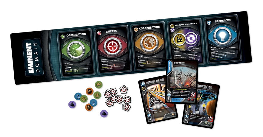 Eminent Domain est un jeu de construction d’Empire dans lequel les capacités de votre Empire sont représentées par un deck de cartes Mission. Au début de la partie, chaque joueur possède un deck identique. Chaque tour, vous devrez choisir une mission à accomplir et vous ajouterez ainsi une des cartes Mission à votre deck. Lorsque vous commandez une mission, vous pouvez renforcer son effet en jouant des cartes de votre main correspondant à la mission choisie. Par exemple, plus votre Empire lance de recherches, plus ses compétences en recherche augmenteront – puisque votre deck contiendra de plus en plus de cartes Recherche !