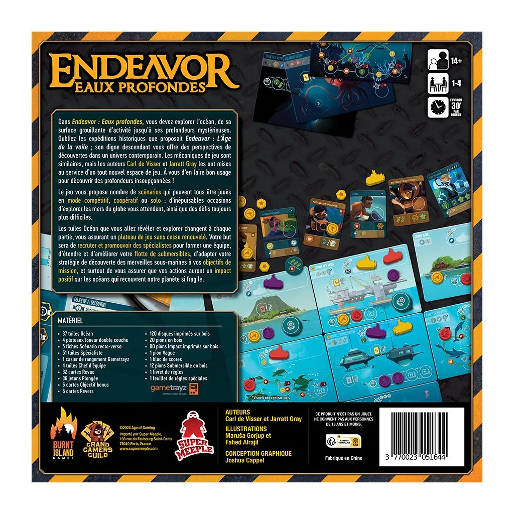 Dans Endeavor : Eaux profondes, vous devez explorer l’océan, de sa surface grouillante d’activité jusqu’à ses profondeurs mystérieuses. Oubliez les expéditions historiques que proposait Endeavor : L’Âge de la voile ; son digne descendant vous offre des perspectives de découvertes dans un univers contemporain. Les mécaniques de jeu sont similaires, mais les auteurs Carl de Visser et Jarratt Gray les ont mises au service d’un tout nouvel espace de jeu. À vous d’en faire bon usage pour découvrir des profondeurs insoupçonnées !