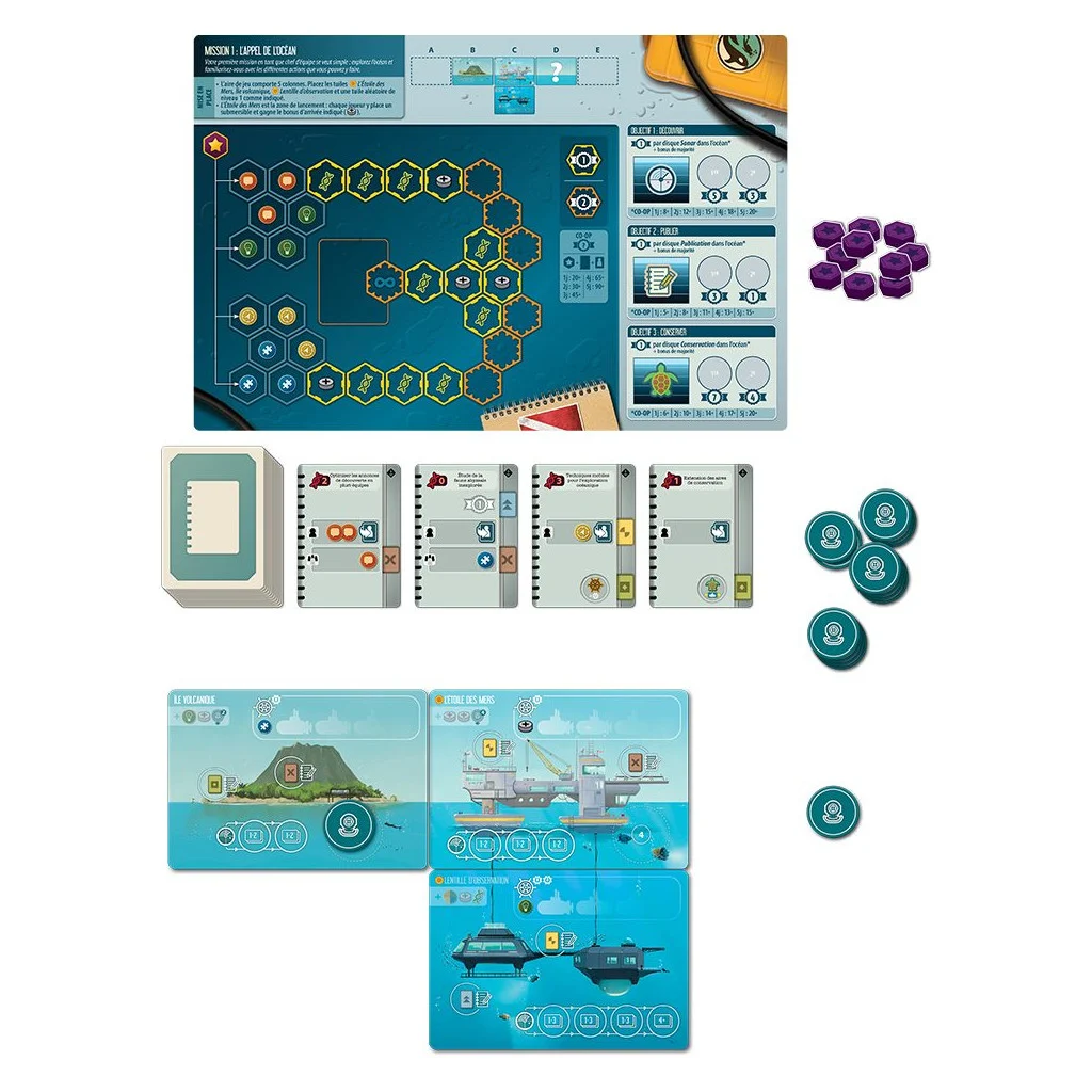 Le jeu vous propose nombre de scénarios qui peuvent tous être joués en mode compétitif, coopératif ou solo : d’inépuisables occasions d’explorer les mers du globe vous attendent, ainsi que des défis toujours plus difficiles. Les tuiles Océan que vous allez révéler et explorer changent à chaque partie, vous assurant un plateau de jeu sans cesse renouvelé. Votre but sera de recruter et promouvoir des spécialistes pour former une équipe, d’étendre et d’améliorer votre flotte de submersibles, d’adapter votre stratégie de découverte des merveilles sous-marines à vos objectifs de mission, et surtout de vous assurer que vos actions auront un impact positif sur les océans qui recouvrent notre planète si fragile