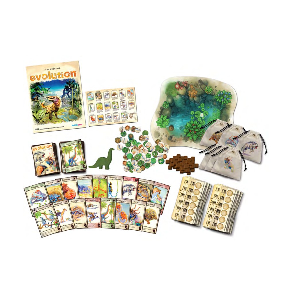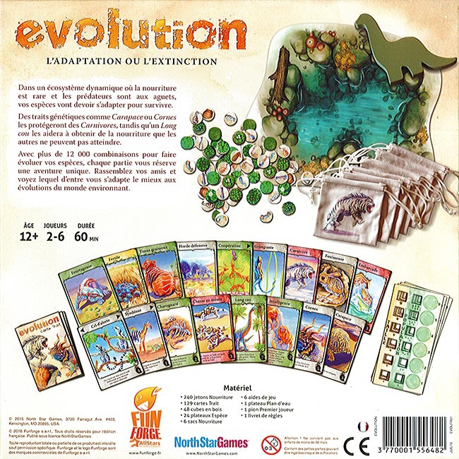 Dans le jeu Evolution, vous cherchez à obtenir un maximum de points en nourrissant vos espèces, en augmentant leur population, et en les faisant évoluer afin de garantir leur survie. À la fin de la partie, les joueurs marquent des points pour : la nourriture consommée par leurs espèces pendant la partie ; la population de leurs espèces survivantes ; les cartes Trait de leurs espèces survivantes.
