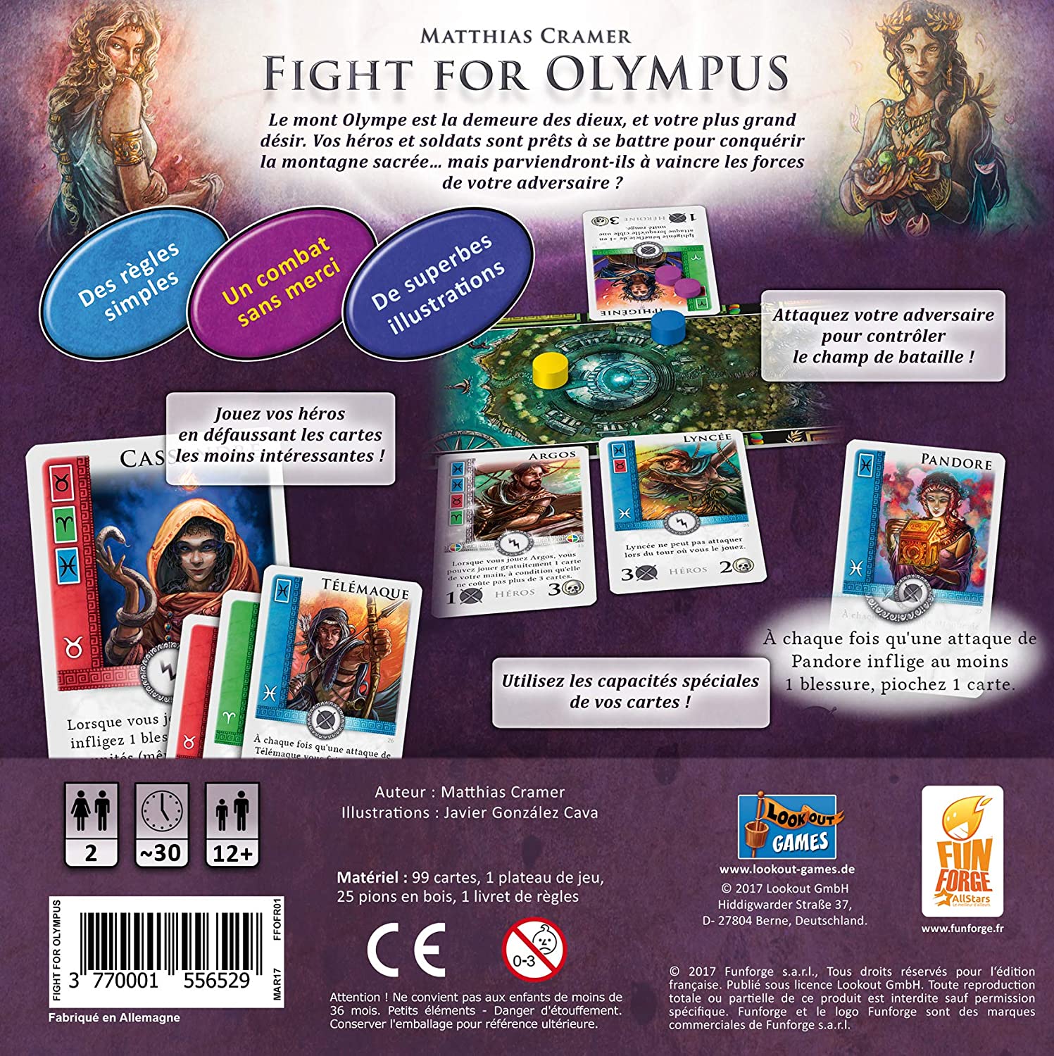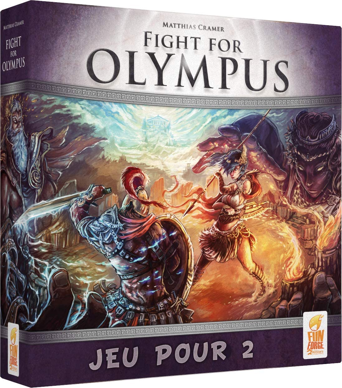 Dans le jeu Fight for Olympus, vos héros et vos troupes vont se battre pour vous, étendant la bataille jusqu’à Troie et Delphes, mais c’est sur le Mont Olympe que tout se jouera ! Le but du jeu est d’être le premier joueur à marquer 7 points de victoire, ou à défaut, d’avoir plus de points que son adversaire à la fin de la partie. Un joueur remporte également la partie s’il occupe tous les espaces situés de son côté du plateau au début de son tour. La partie s’arrête donc lorsqu’une des conditions suivantes est remplie : La pioche est épuisée. Dans ce cas, le joueur qui a le pion violet de son côté gagne la partie. Si le pion violet est au milieu (à 0 point de victoire), la partie se termine sur une égalité. Un joueur occupe tous les espaces de son côté du plateau au début de son tour. Il gagne la partie. Un joueur a 7 points de victoire. Il gagne la partie.
