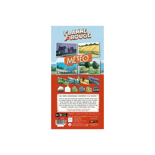 Avec un peu de chance les coureurs feront route avec un soleil clément ou même mieux avec un vent arrière. Mais d‘autres fois, ils devront supporter des vents de travers ou des vents de face qui les ralentiront. Dans le pire des cas, ils affronteront la pluie et les coureurs risquent alors d‘enchaîner les chutes. Ce jeu est une extension : le jeu de base Flamme rouge est requis pour jouer !
