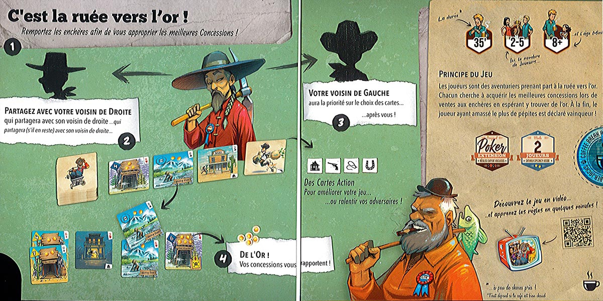 C’est ensuite au tour du joueur à la gauche du meilleur enchérisseur de choisir une carte,et ainsi de suite dans le sens des aiguilles d’une montre jusqu’à ce que tous les joueurs aient pris une carte. Le gagnant de l’enchère lance les deux dés pour déterminer dans quelles mines de l’or a été trouvé.Le premier joueur à avoir deux concessions dans la même ville devient le Maire. Désormais, chaque fois qu’un joueur prendra parmi les cartes en vente une Concession dans une ville dont un autre joueur est le Maire, il devra payer au Maire.