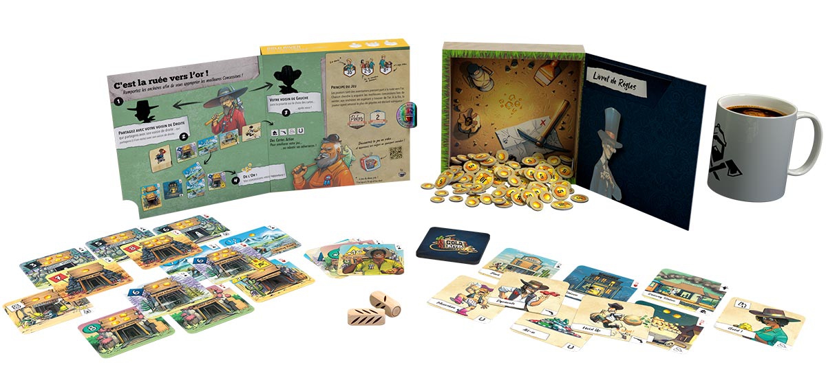 Dans le jeu Gold River, vous incarnez des aventuriers prenant part à la ruée vers l’or. Faites l’acquisition des meilleurs filons lors de ventes aux enchères puis, avec de la chance aux dés, vous y trouverez de l’or !
