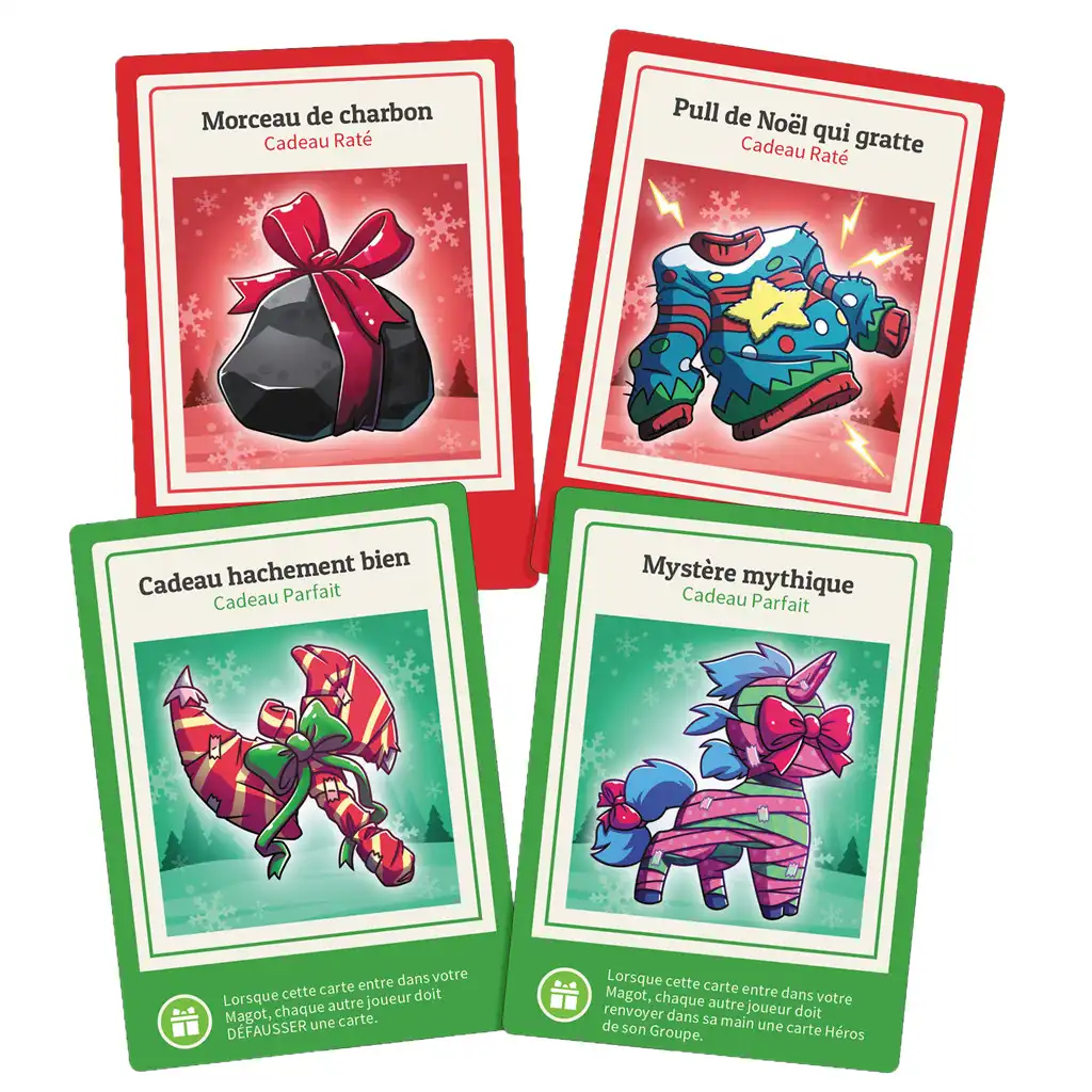 Cette extension pour Here to Slay sur le thème des fêtes de fin d’année sera votre plus beau cadeau de Noël ! Vous y découvrirez 2 nouveaux types de cartes, mais aussi des cartes transparentes à superposer sur vos Chefs de Groupe pour leur conférer des effets inédits. La nouvelle condition de victoire ajoutera encore plus de piquant à vos parties !