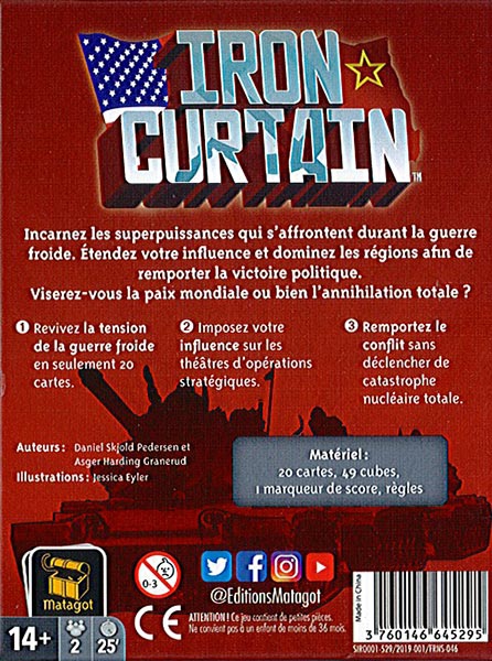 Dans le jeu de cartes Iron Curtain, vous incarnez les USA ou l’URSS, et allez tenter de remporter la Guerre Froide en construisant tour après tour un monde fait de cartes qui de ce fait changera à chaque partie !