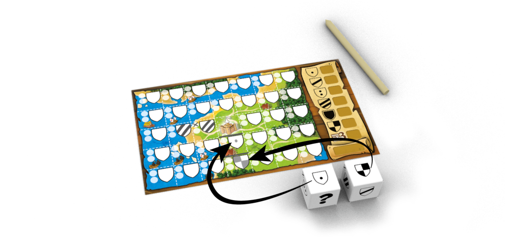 Kingdomino Duel est un jeu de dés dans lequel chaque joueur constitue un domino à son tour de jeu en associant 2 dés sélectionnés et le dessine sur sa carte. A chaque tour, le premier jour choisira 1 dé en premier et 1 dé en dernier. Les zones créées vont marquer des points de la même façon que dans le jeu d’origine.