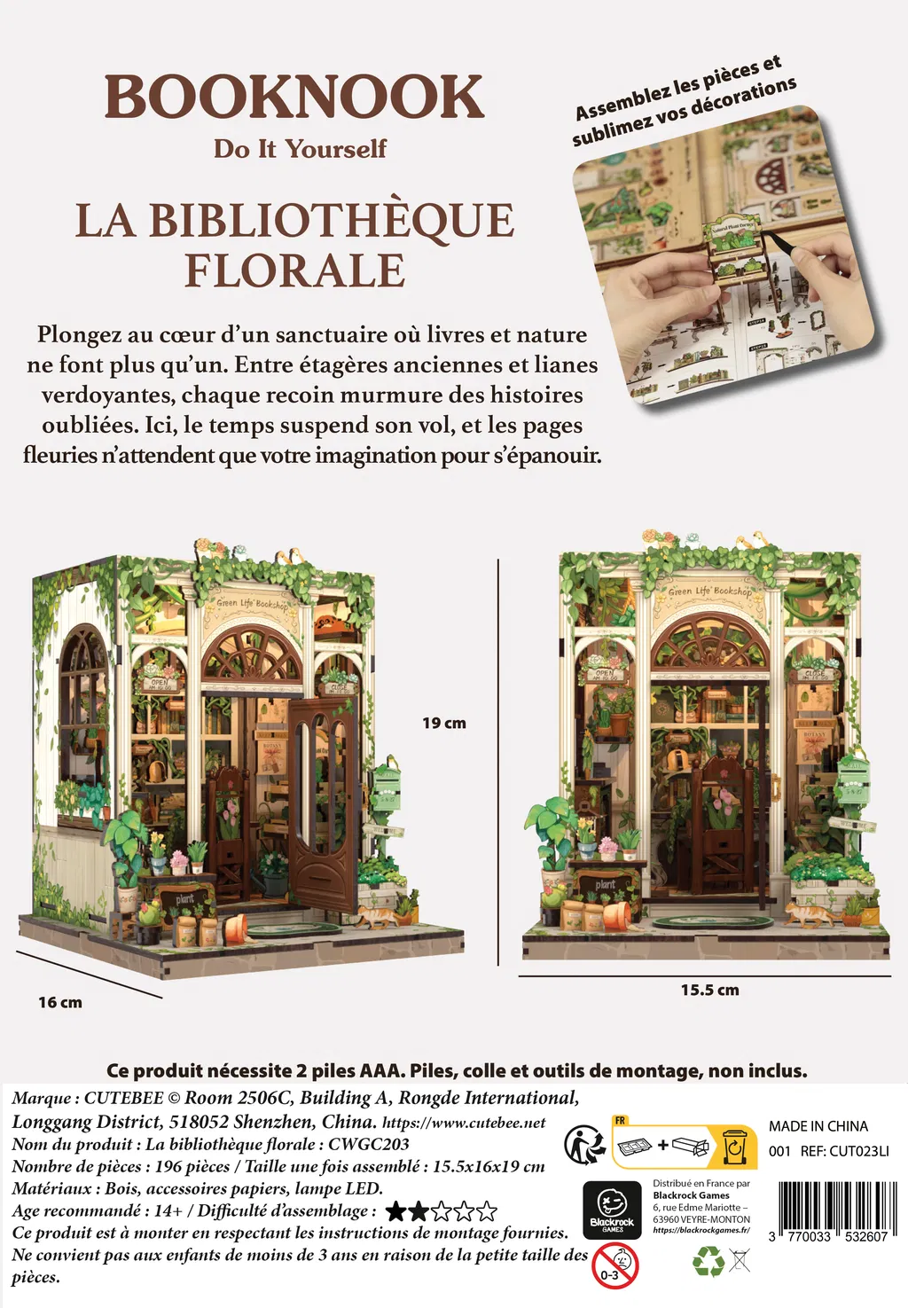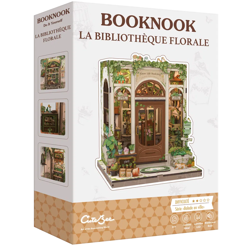 Booknook – La bibliothèque florale, Un Booknook est une petite scène ou un diorama à construire soit même, qui se glisse entre les livres sur une étagère. Ils donnent l’impression d’une « fenêtre » vers un autre monde, comme si la bibliothèque abritait une porte secrète ou une ruelle magique.