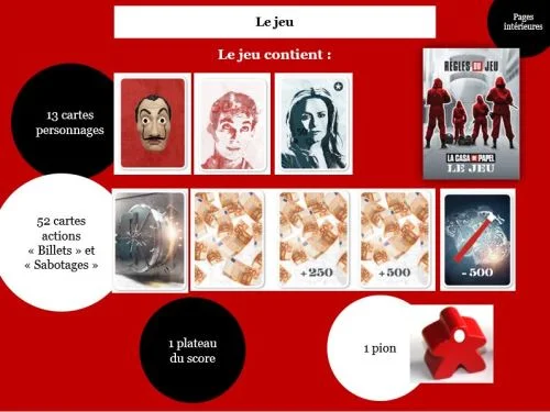 Dans ce jeu de bluff et d’identités secrètes dans l’univers de la série phénomène La Casa de Papel, deux équipes s’affrontent :les braqueurs, aidés du Professeur, doivent imprimer le plus de billets possible avant la fin du 5e tour. Les otages, aidés de l’inspectrice Raquel Murillo, doivent à tout prix les en empêcher ! Mais à qui se fier ?