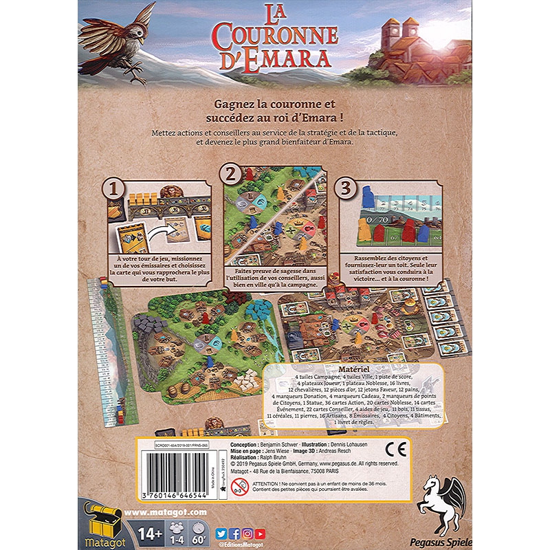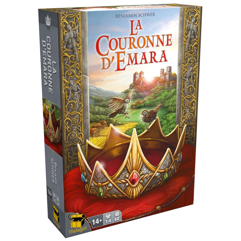 Au royaume d’Emara, tout va bien : ni guerre ni révolte à l’horizon ! Le roi Thedorius le Sage se soucie davantage du bien-être de ses sujets que du pouvoir ou de la richesse. Et il cherche aujourd’hui son successeur ! Celui qui saura convaincre la majorité des citoyens en répondant à leurs besoins et en leur offrant un logement deviendra le futur roi d’Emara ! La Couronne d’Emara combine les actions de cartes aux actions de mouvement, en y ajoutant de la gestion de ressources. Planifiez vos tours, tirez le meilleur parti de vos conseillers, optimisez chaque mouvement et n’oubliez pas, seul le score le plus bas compte !