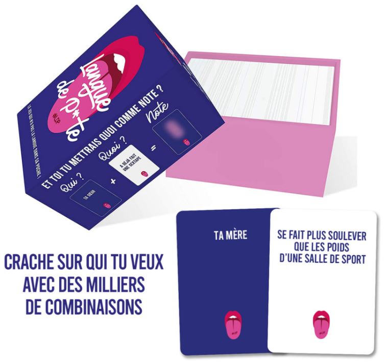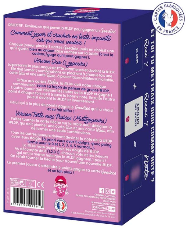 Langue de P*te est le nouveau jeu de société pour adultes qui va remettre en question toutes vos relations. Le but est de gagner des cartes Goodies en notant des associations de cartes “Qui” avec des cartes “Quoi”.