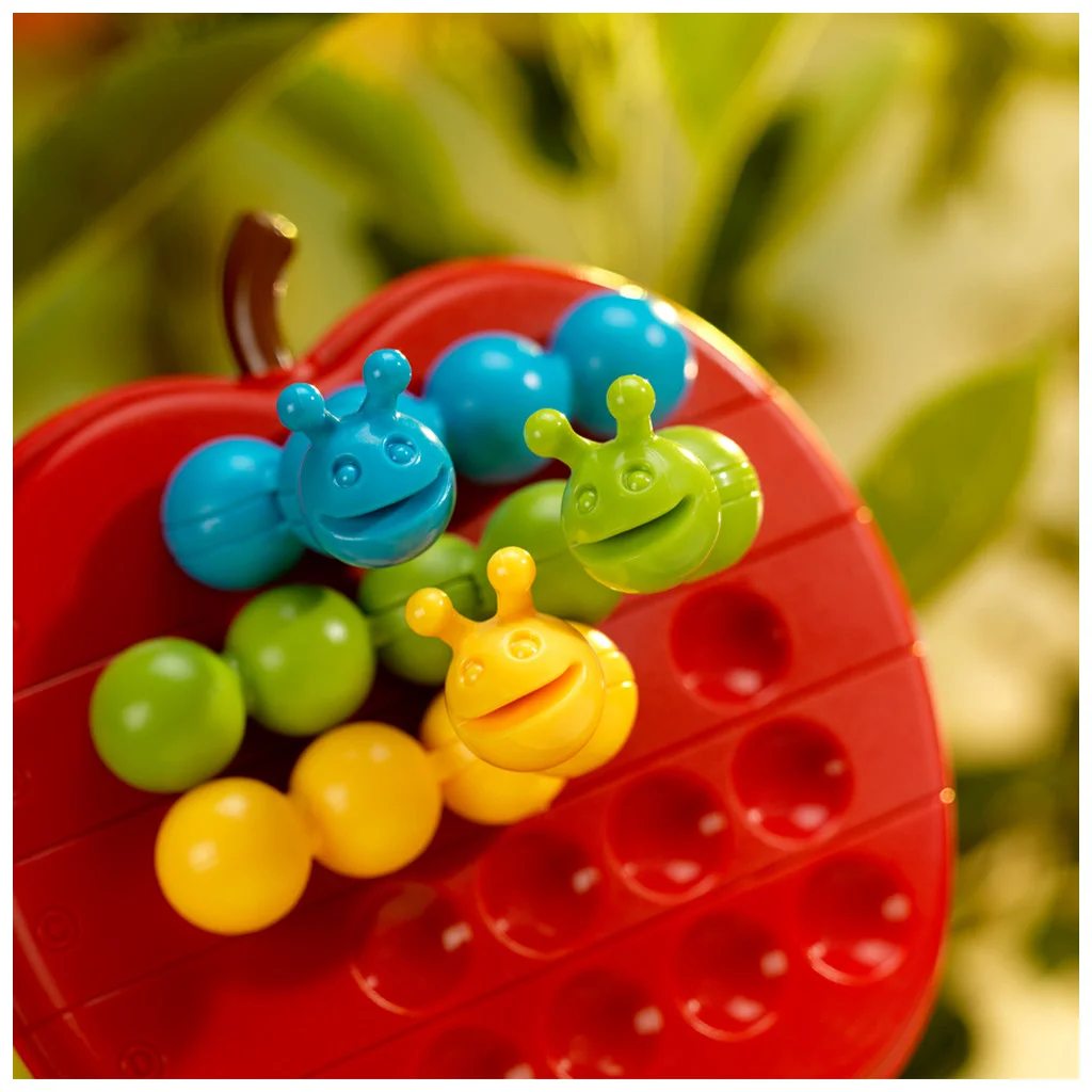 Trois chenilles très gourmandes ont décidé de faire un festin d’une pomme juteuse. Saurez-vous toutes les faire tenir à l’intérieur du fruit afi n de leur assurer un garde-manger ? «Le festin des chenilles» contient un plan de jeu interchangeable innovant ainsi que trois pièces de jeu que vous pourrez couder pour obtenir des formes originales. Votre logique se devra d’être fl exible pour résoudre les soixante défi s du jeu, de facile à expert.