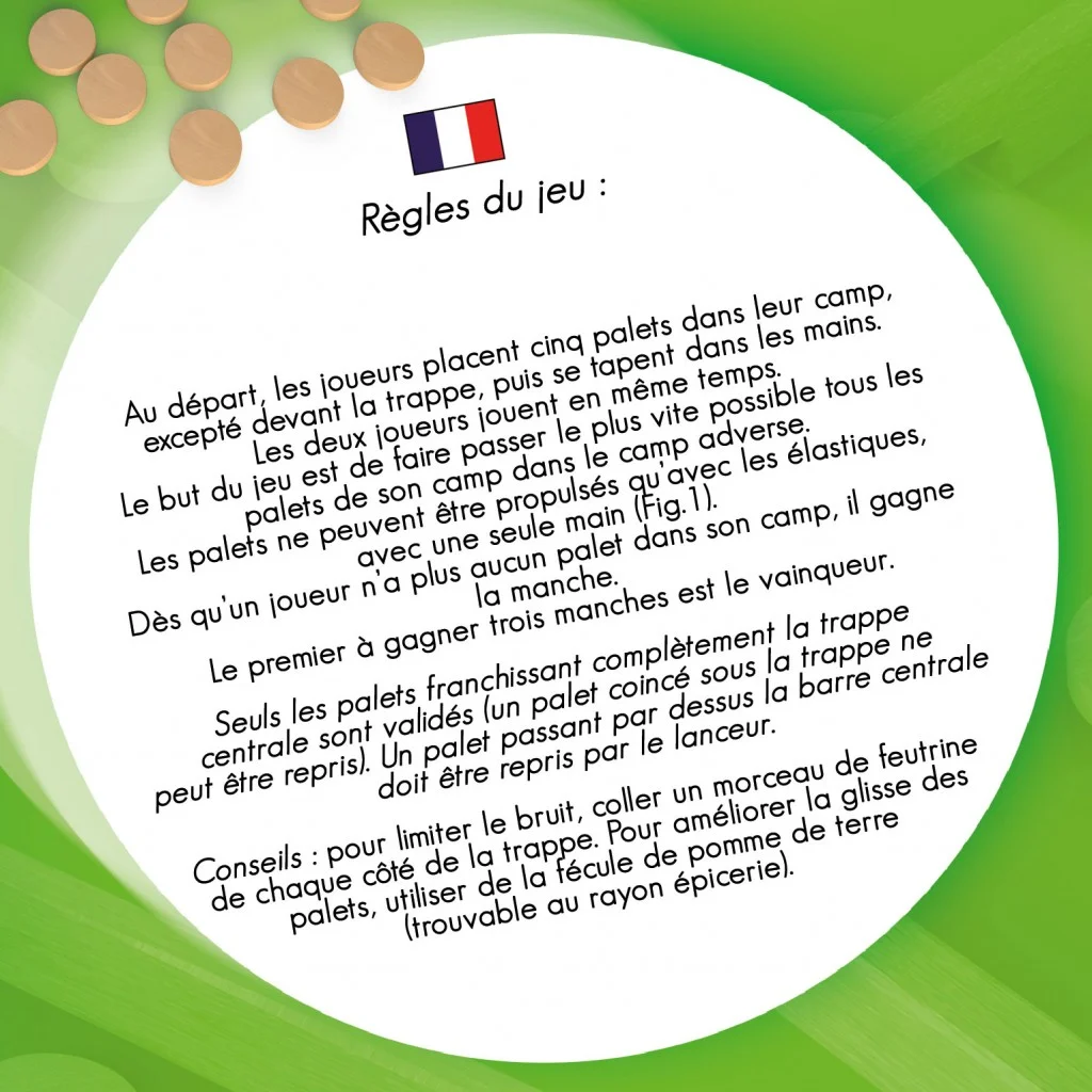 Au départ, chaque joueur place ses palets où il veut dans son camp excepté devant la trappe.