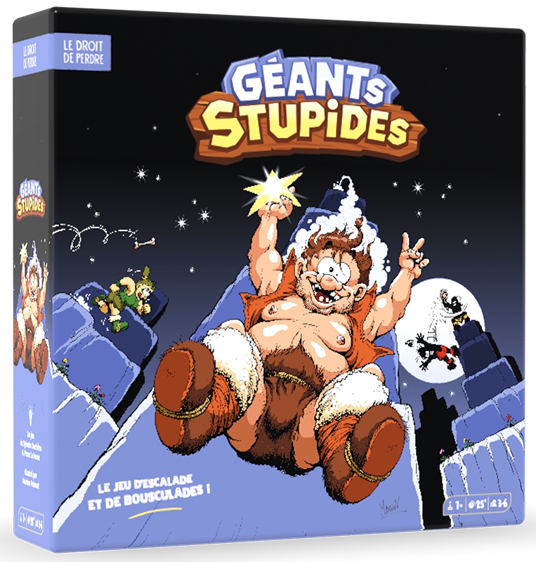 Avec Géants stupides, tu débarques avec tes rivaux sur l’île mythique de la Montagne de la nuit. L’objectif : décrocher des étoiles ! Alors grimpe avec ton géant et prie l’ancêtre pour bouger des rochers… Vise l’endroit le plus haut possible et sauter pour attraper des étoiles ! Mais plus tu seras gourmand, plus les nonos qui volent et les coups de carcasses entraîneront de vilaines chutes ! Un jeu en bois, haut en couleurs, accompagné de dessins de Marion Poinsot, l’illustratrice des BD Naheulbeuk. Avec plusieurs niveaux : du géant débutant à l’expert stupide !