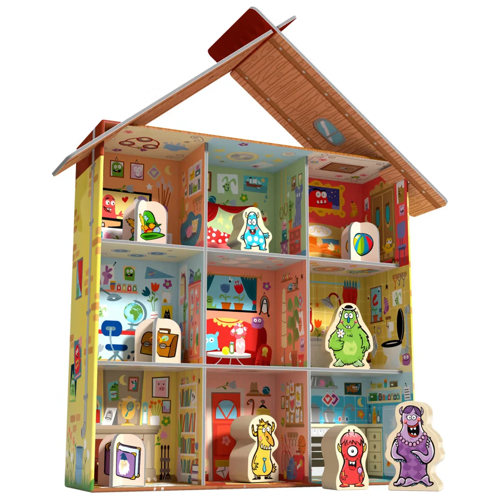 Contenu: 1 maison (= fond de la boîte illustré), 1 ensemble de murs et planchers (en 4 parties qui s’emboîtent), 1 toit (en 2 parties), 5 monstres, 4 objets fétiches, 1 livret avec 60 missions et solutions, 1 règle du jeu.