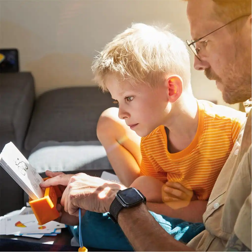 Le but du jeu est de déchiffrer et résoudre diverses énigmes. À l’aide du stylet en bois, l’enfant peut vérifier lui-même s’il a trouvé la bonne solution. S’il est possible de retirer la carte du socle, c’est que la réponse est bonne ! Cette activité renforce la motivation et la compétence dans la résolution de problèmes en toute autonomie. Dès que l’énigme est résolue, l’enfant change de carte et le prochain défi l’attend déjà !