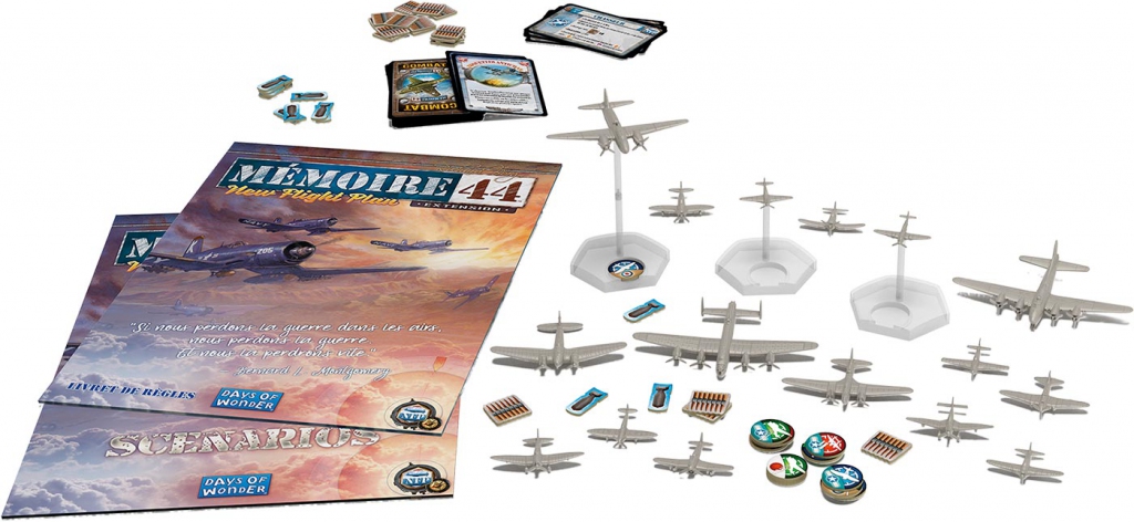 La suprématie aérienne fut un défi permanent de la Seconde Guerre mondiale. Lors de la bataille de France, les puissants Stuka de la Luftwaffe jouèrent un rôle-clé dans la Blitzkrieg qui donna la victoire aux Allemands. Au-dessus de la Manche, l’héroïsme des pilotes de la RAF sauva leur pays de l’invasion. Dans les cieux de Koursk, Smolensk ou Stalingrad, de nombreux pilotes soviétiques défendirent leurs terres contre les bombardiers ennemis. Au-dessus des îles du Pacifique, les chasseurs américains durent livrer un combat désespéré pour tenir face aux puissants Zero japonais. Et lorsque les forces alliées débarquèrent en Europe, ce fut sous une couverture constante de chasseurs, chasseurs-bombardiers et bombardiers. La suprématie aérienne des Alliés était alors totale. Avec l’extension New Flight Plan, envoyez vos bombardiers contre des objectifs stratégiques, mais faites attention à la chasse adverse ! Lancez vos chasseurs-bombardiers pour appuyer vos troupes au sol ! Les nouvelles règles aériennes vous offrent de nombreuses options tactiques dont vous pourrez faire bon usage dans les scénarios proposés. Mais vous pouvez aussi les utiliser dans tous les scénarios parus à ce jour, sur tous les théâtres d’opérations, pour apporter une nouvelle dimension à vos parties de Mémoire 44 ! Cette extension nécessite le jeu de base Mémoire 44. D’autres extensions sont nécessaires pour jouer certains scénarios.