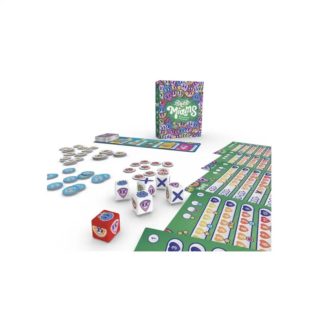 Le but : avoir coché 50 cœurs avant vos adversaires et marquer le maximum de points ! Chaque lancer vous offre des choix : quelles brochettes de fruits avez-vous le plus de chance de générer ? Quels dés relancer ? Faut-il utiliser le dé rouge bonus ? A chaque tour, vous pourrez aussi acheter des cartes Miams aux effets variés pour booster votre stratégie : effets permanents, bonus immédiats ou fin de tour… Pimpez votre jeu des bons effets pour enchaîner les combos !