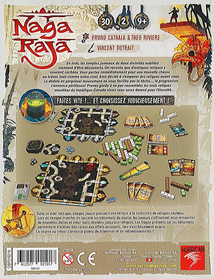 Nagaraja est un jeu de course tactique pour deux joueurs. Ses mécaniques sont simples, originales et se combinent pour des parties rapides. Il s’adresse aux joueurs occasionnels et expérimentés. Vous voici plongés dans les temples jumeaux de divinités oubliées, en Inde ! Les joueurs ont pour but d’obtenir 25 points de victoire, en accumulant sur leurs plateaux modulaires (le temple qu’ils explorent) des reliques sacrées.