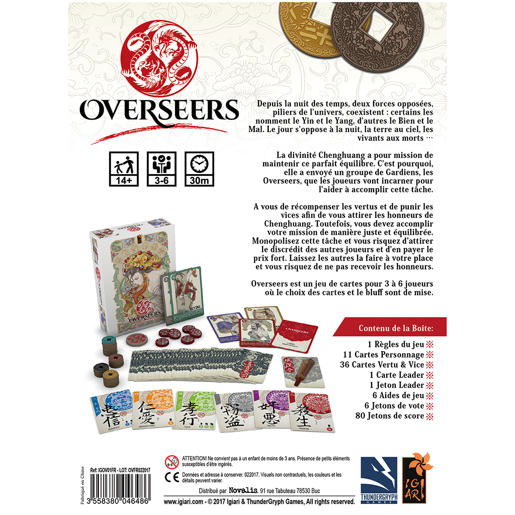 La divinité Chenghuang a pour mission de maintenir ce parfait équilibre. C’est pourquoi, elle a envoyé un groupe de Gardiens, les Overseers, que les joueurs vont incarner pour l’aider à accomplir cette tâche. A vous de récompenser les vertus et de punir les vices afin de vous attirer les honneurs de Chenghuang. Toutefois, vous devez accomplir votre mission de manière juste et équilibrée. Monopolisez cette tâche et vous risquez d’attirer le discrédit des autres joueurs et d’en payer le prix fort. Laissez les autres la faire à votre place et vous risquez de ne pas recevoir les honneurs.