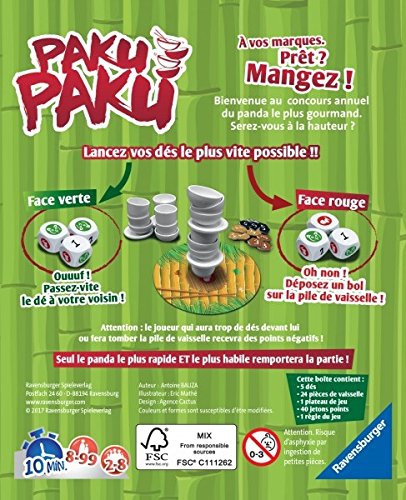 Une fois encore les plus grands pandas d’Asie se retrouvent pour un concours à la vie, à la ? boulette de riz. Et comme chaque année, il ne pourra en rester qu’un : Celui pour qui une assiette n’est jamais assez pleine ! Celui dont l’estomac est aussi puissant que sa volonté ! Celui qui sera aussi adroit qu’affamé ! Lancez vos dés le plus vite possible !! Une face verte ? Ouuuuf ! Passez vite le dé à votre voisin ! Une face rouge ? Oh non ! Déposez un bol sur la pile de vaiselle, ce qui vous fait perdre de précieuses secondes. Rapidement la vaiselle s’entasse et la pile devient de plus en plus haute. Le joueur qui aura trop de dés devant lui ou fera tomber la pile de vaisselle recevra des points négatifs ! Seul le panda le plus rapide ET le plus habile remportera la partie ! Alors à vos marques. Prêts ? MANGEZ!!!