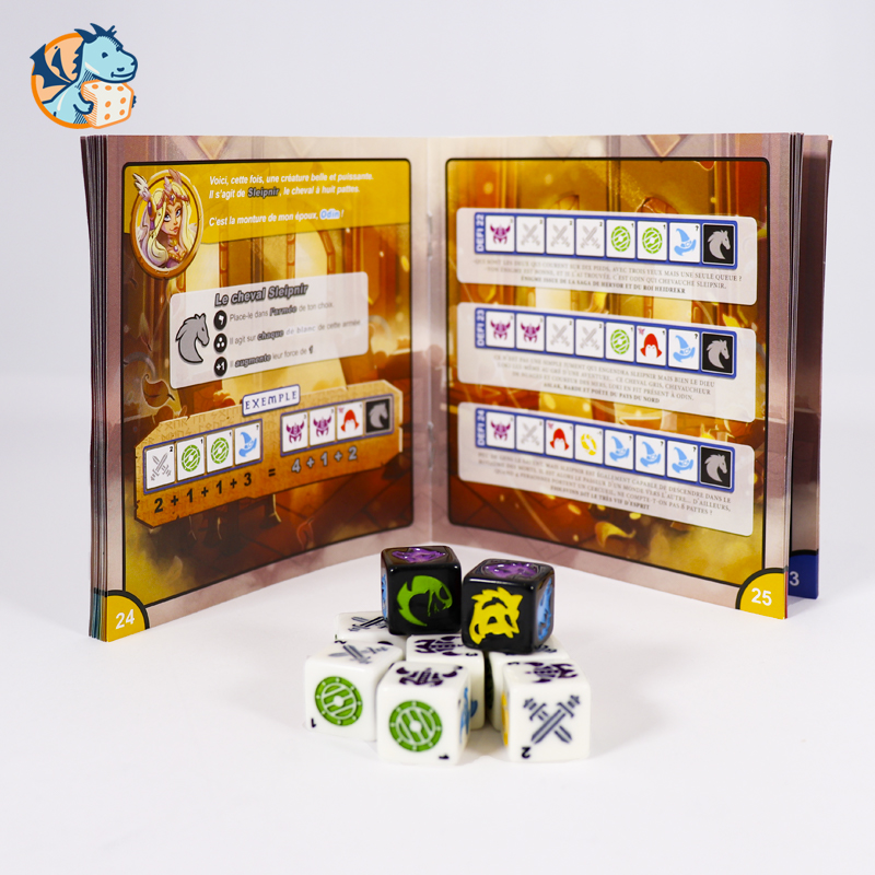 Chaque face a une valeur et un pouvoir qui lui est spécifique. Lors de chaque défi, le joueur devra placer les dés sur les faces indiquées par le défi, puis il devra séparer ces dés en deux groupes de valeur identique. De vraies énigmes logiques à chaque fois ! Au fur et à mesure du jeu, le joueur découvrira de nouveaux dés avec des faces de plus en plus retorses et de nouvelles légendes qui lui permettront de découvrir l’univers de la mythologie nordique. Une petite boîte pour des heures de jeu !