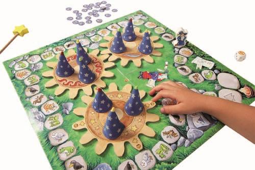 Merlin le grand magicien vient tester la mémoire des apprentis sorciers. Les neufs chapeaux cachent des animaux. En avançant avec le dé, Merlin indique quel animal est recherché. Si l’apprenti sorcier soulève le bon chapeau avec la baguette magnétique, il remporte une étoile. Mais il faut bien observer les engrenages… Les joueurs peuvent avoir à les faire tourner ! Qui aura suffisamment de mémoire pour récupérer le plus d’étoiles ?