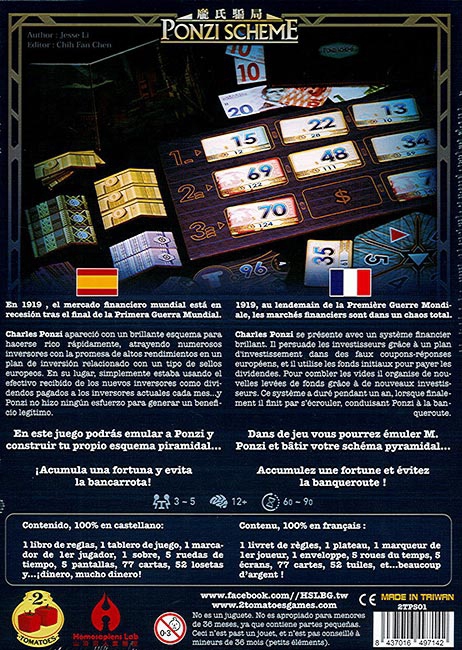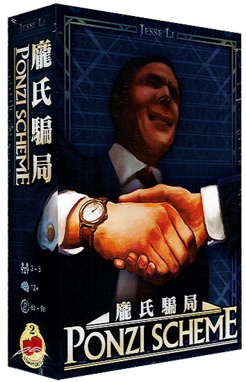 Dans le jeu Ponzi Scheme, les joueurs sont des professionnels de la finance qui lèvent des fonds en annonçant des plans d’investissement dans différentes industries. Au jour donné, les joueurs doivent payer les intérêts promis. De plus, les joueurs peuvent échanger ces industries virtuelles grâce à des opérations entre initiés. Lorsqu’un joueur n’arrive pas à payer les intérêts, la partie se termine immédiatement. Tous les joueurs qui ont « survécu » marquent des points selon leurs industries virtuelles.