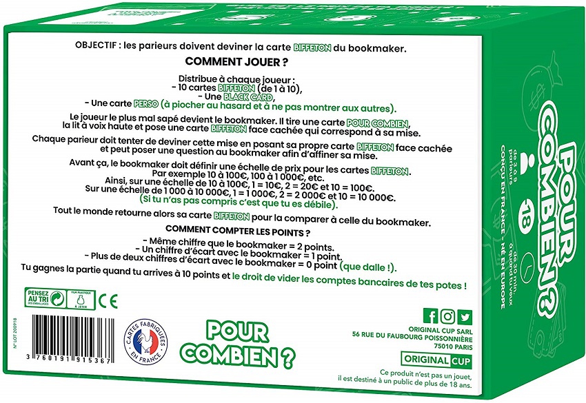 Le jeu d’ambiance Pour Combien, c’est le jeu qui va montrer à tes potes à quel point tu es en manque d’argent. Paris, biffetons, bonus, tout ça réunis dans 400 cartes uniques ! Prépare-toi à juger tes potes.