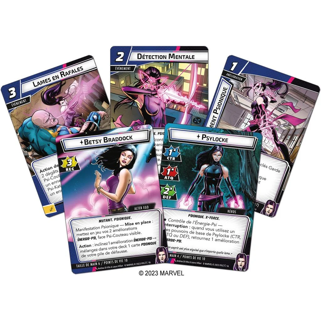 Psylocke a un deck Justice. Elle est experte dans le maniement des lames, qu’elles soient matérielles ou psioniques. Ses améliorations ÉNERGIE-PSI qui sont des cartes recto verso lui apportent des bonus de CTR d’un côté et d’ATQ de l’autre.