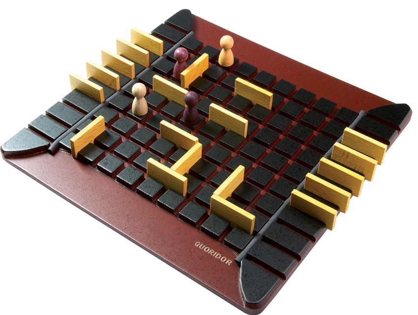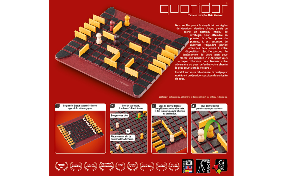Votre problème : l’adversaire pose des barrières pour vous ralentir ! Rassurez-vous : il doit vous laisser au moins un passage libre. Mais qui aura le chemin le plus court ? Un jeu captivant et vraiment drôle, accessible à tous. Les joueurs se partagent les barrières et chacun pose son pion au centre de sa ligne de départ. A tour de rôle, chacun déplace son pion d’une case, ou pose une barrière afin de ralentir l’adversaire. Les pions doivent contourner les barrières, qui créent un labyrinthe dont il faut sortir très vite, car le premier qui atteint la ligne opposée à sa ligne de départ a gagné !