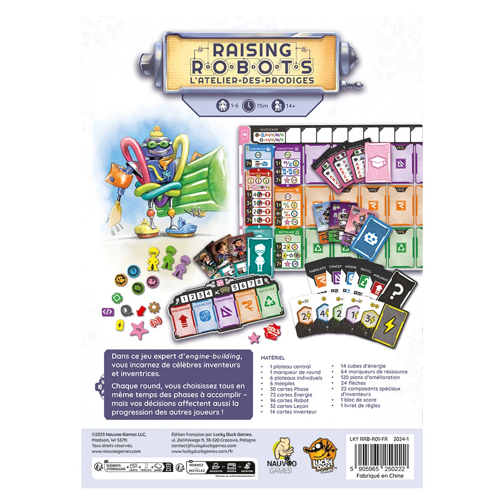 Dans Raising Robots, vous êtes un célèbre inventeur qui cherche à rassembler la plus grande collection de robots. À chaque tour, vous choisissez et réalisez simultanément deux actions ou plus : améliorer, assembler, concevoir, fabriquer, recycler. Chaque action est exécutée avec une puissance variable qui permet de l’améliorer ou de l’aggraver. Cependant, les actions les plus puissantes aideront également vos adversaires. Celui qui a le plus de points après huit rounds gagne.