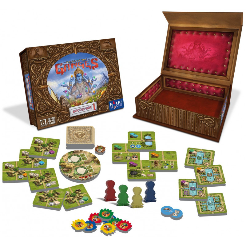 Il contient 3 modules Gange qui ont déjà été publiés en tant qu’éléments du «Brettspieladventskalender» (un calendrier de l’avent pour jeu de plateau) et du «Deutsche Spielepreis Goodie Box» : Le Village au Manguier, les jardins de Shalimar (extension du Serpent) et l’extension du Tigre.