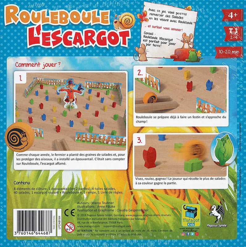 Rouleboule L’Escargot est un jeu d’adresse dans lequel vous ferez glisser votre escargot le long de la rampe et essaierez de réussir un lancer idéal pour ne collecter que vos salades car si vous touchez les salades de vos adversaires, ils les récoltent, et si vous touchez l’épouvantail, personne ne récolte rien !