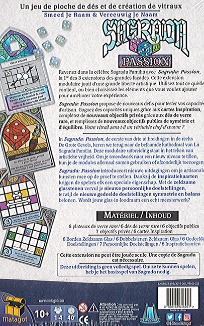 Passion propose le « Rare glass module », un dé transparent obtenu comme un outil, qui peut outrepasser les contraintes de pose, et de nouveaux objectifs. Le « module Inspiration » donne quant à lui un pouvoir différent à chaque joueur… De nouvelles composantes pour Sagrada !