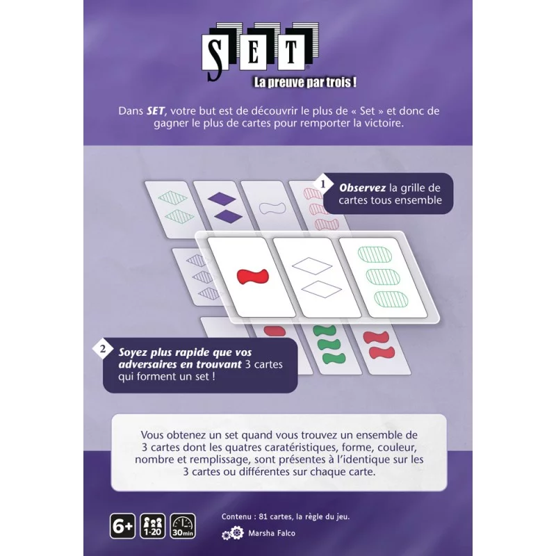 Le but du jeu consiste à observer les cartes exposées sur la table pour être le plus rapide à identifier un SET. Chaque carte présente des symboles qui combinent 4 caractéristiques : COULEUR (rouge, vert ou mauve), FORME (ovale, vague ou losange), NOMBRE (un, deux ou trois symboles), REMPLISSAGE (plein, hachuré ou vide). Un SET est un ensemble de 3 cartes dont chacune des 4 caractéristiques est soit totalement identique, soit totalement différente aux 2 autres cartes. Qui sera le plus rapide et trouvera le premier des Sets de 3 cartes parmi les 12 posées sur la table ?