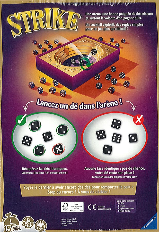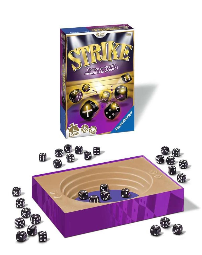 Une arène, une bonne poignée de dés chacun et surtout la volonté d’en gagner plus!Voici le cocktail explosif que Strike nous propose. Lancez votre dé avec dextérité sur ceux déjà présents dans l’arène. Obtenez au moins deux faces identiques et remportez les dés correspondants. Recommencez autant de fois que vous le souhaitez! Stop ou encore ? A vous de décider ! Mais attention : aucune face identique et vos dés restent dans l’arène, une croix et ils sont éliminés ! Remportez tous les dés et le joueur suivant sera obligé de tenter le Grand Lancer ! Qui réussira à rester en lice pour être consacré « Grand vainqueur de l’arène » ?